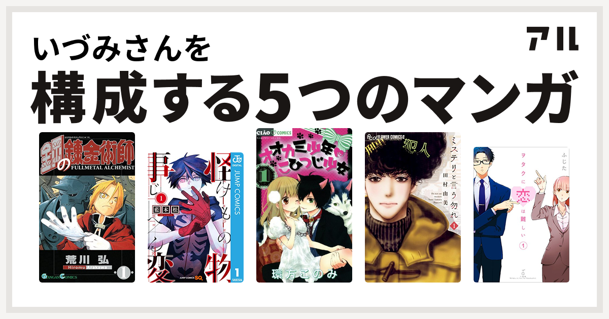 いづみさんを構成するマンガは鋼の錬金術師 怪物事変 オオカミ少年 こひつじ少女 ミステリと言う勿れ ヲタクに恋は難しい 私を構成する5つのマンガ アル